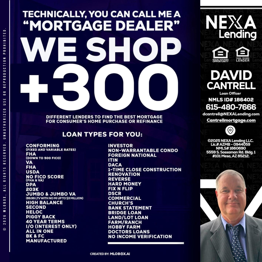 Hi, my name is David Cantrell. I’m a Loan Officer with NEXA Lending LLC., offering personalized mortgage solutions, fast customized quotes, great rates and service with integrity.