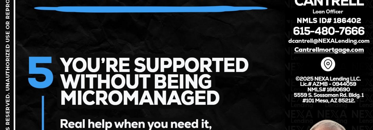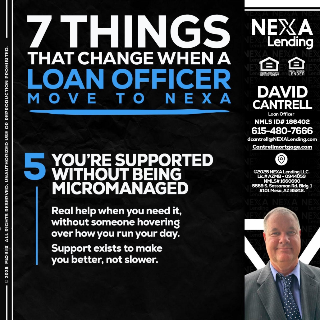 7 THINGS (5) - David Cantrell -Loan OfficerHi, my name is David Cantrell. I’m a Loan Officer with NEXA Lending LLC., offering personalized mortgage solutions, fast customized quotes, great rates and service with integrity.