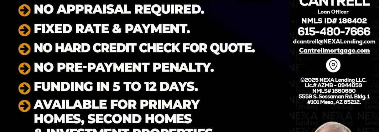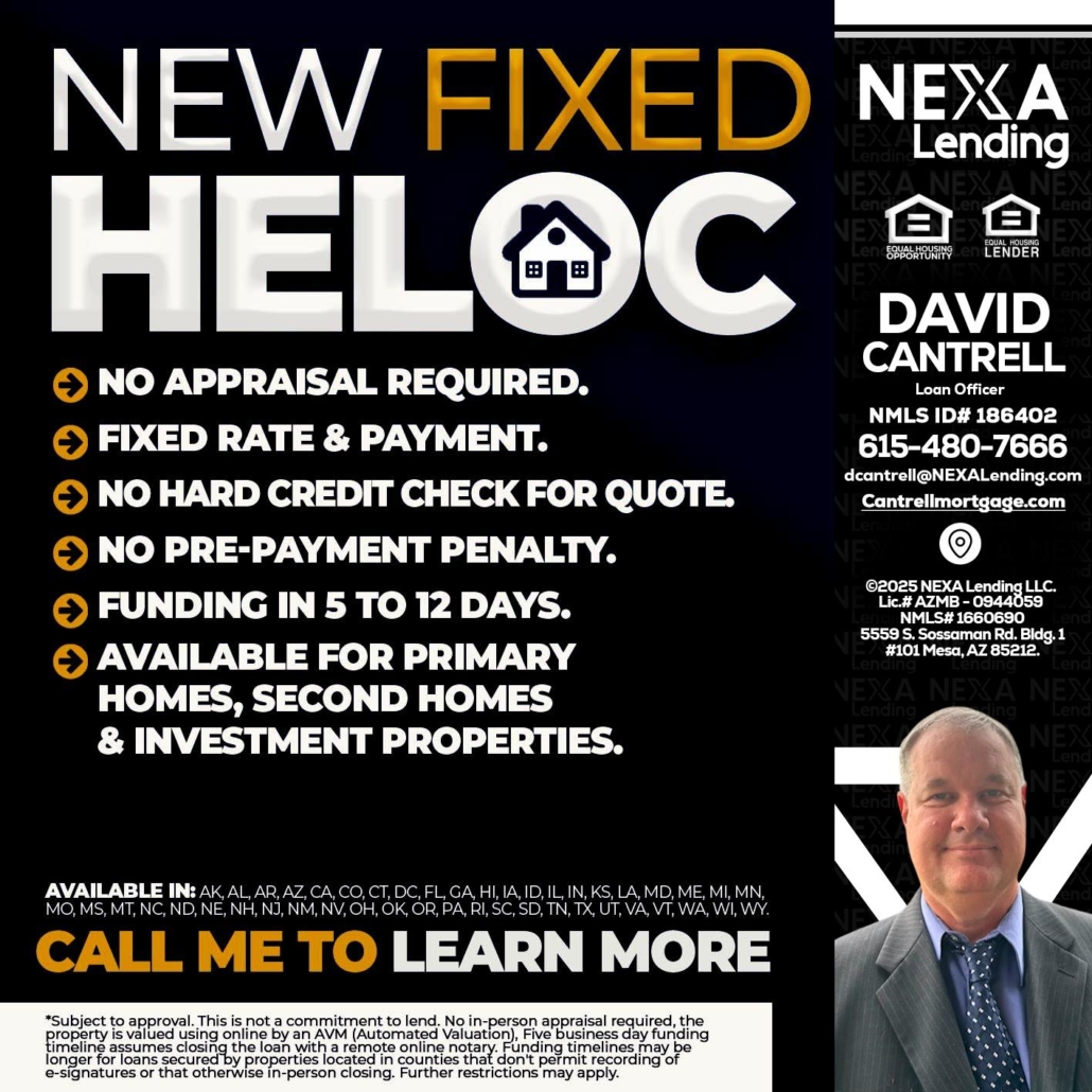 HELOC - David Cantrell -Loan OfficerHi, my name is David Cantrell. I’m a Loan Officer with NEXA Lending LLC., offering personalized mortgage solutions, fast customized quotes, great rates and service with integrity.