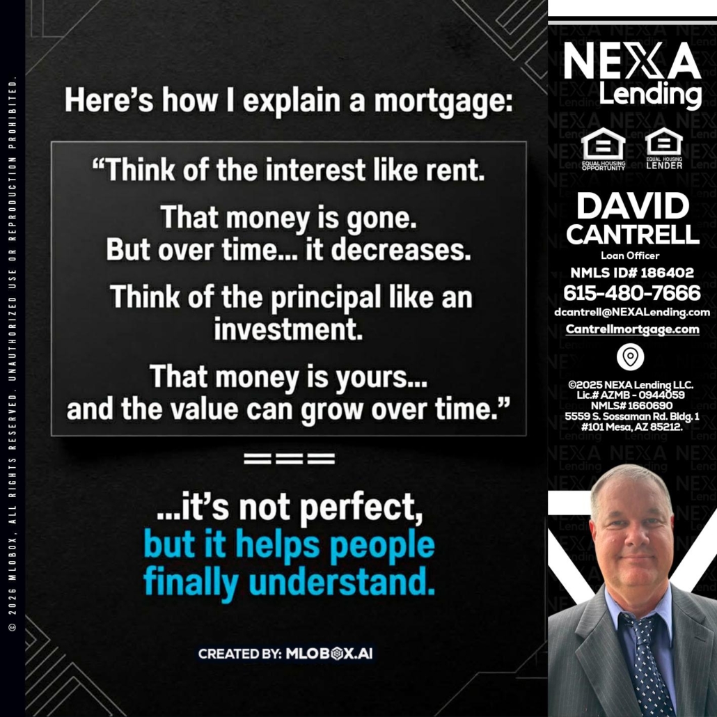 Hi, my name is David Cantrell. I’m a Loan Officer with NEXA Lending LLC., offering personalized mortgage solutions, fast customized quotes, great rates and service with integrity.