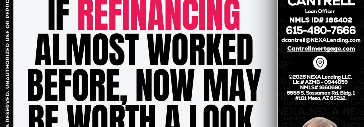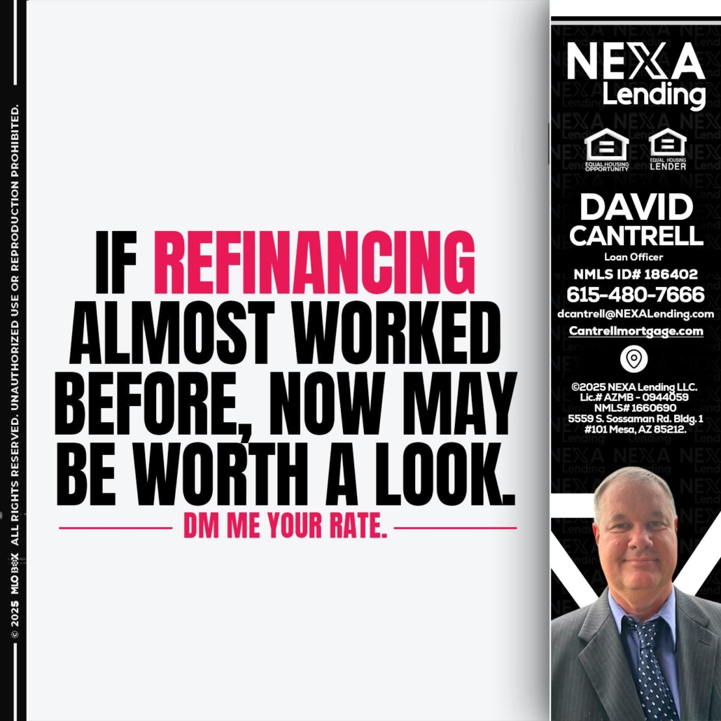 if refinancing - David Cantrell -Loan OfficerHi, my name is David Cantrell. I’m a Loan Officer with NEXA Lending LLC., offering personalized mortgage solutions, fast customized quotes, great rates and service with integrity.
