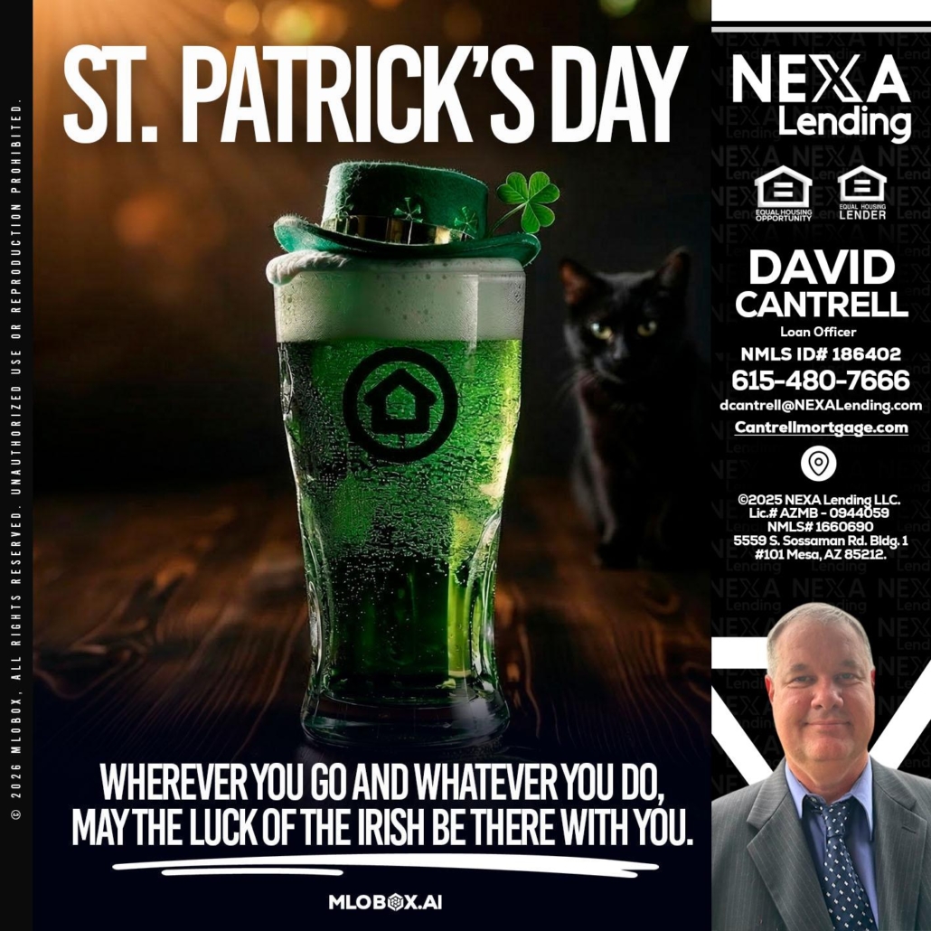 st. Patricks day - David Cantrell -Loan OfficerHi, my name is David Cantrell. I’m a Loan Officer with NEXA Lending LLC., offering personalized mortgage solutions, fast customized quotes, great rates and service with integrity.
